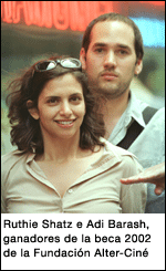 RUTHIE SHATZ e ADI BARASH, jóvenes cineastas de Israel, son también ganadores de la beca 2002 de la Fundación Alter-Ciné con su proyecto documental GARDEN . El jurado formado de siete miembros destacó la importancia de dar a conocer esta realidad negada por la sociedad de Israel, el respecto y el humanismo en la manera de acercarse al tema, la confianza que se desarrolló con los personajes y la sutileza del tratamiento cinematográfico por parte de los cineastas.